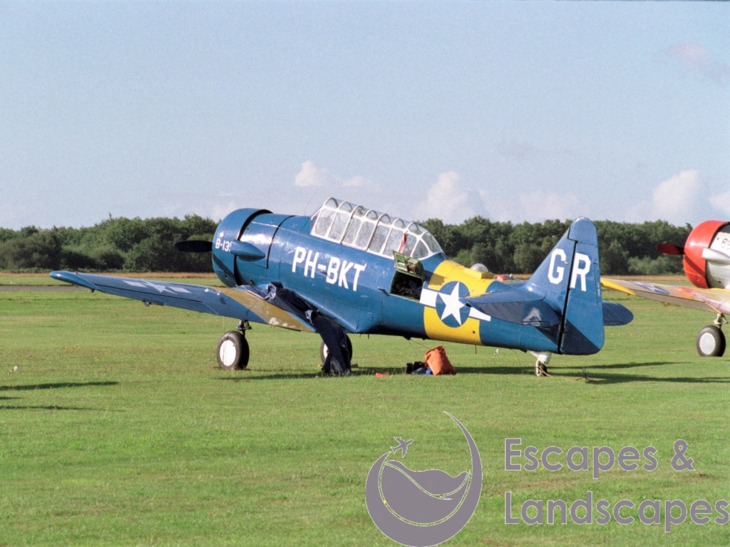 Harvard llB PH-BKT Code: GR/ B-135 Operator: Unconfirmed 2/3 rear view static Photographed, in all blue US Navy scheme with yellow bands, at West Malling '7th Great Warbirds Air Display' on 29.08.88 Original image medium: 35mm colour negative Scan dimensions: 2337 x 1553 pixels>
